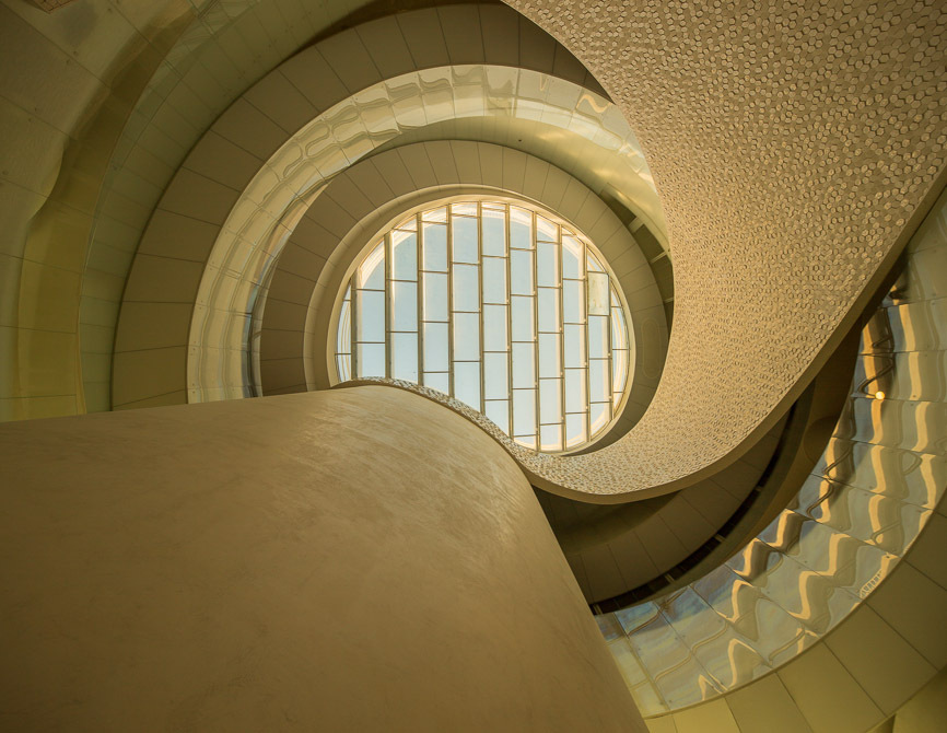 Encantado pela curva do molhe e por este compromisso e vocação intermediários, enlaça laminas curvilíneas gerando-se e prolongando-se na forma de 3 tentáculos principais exteriores e um quarto que cai no seu interior, numa rampa helicoidal que liga todas as funções internas em pé-direito quádruplo.